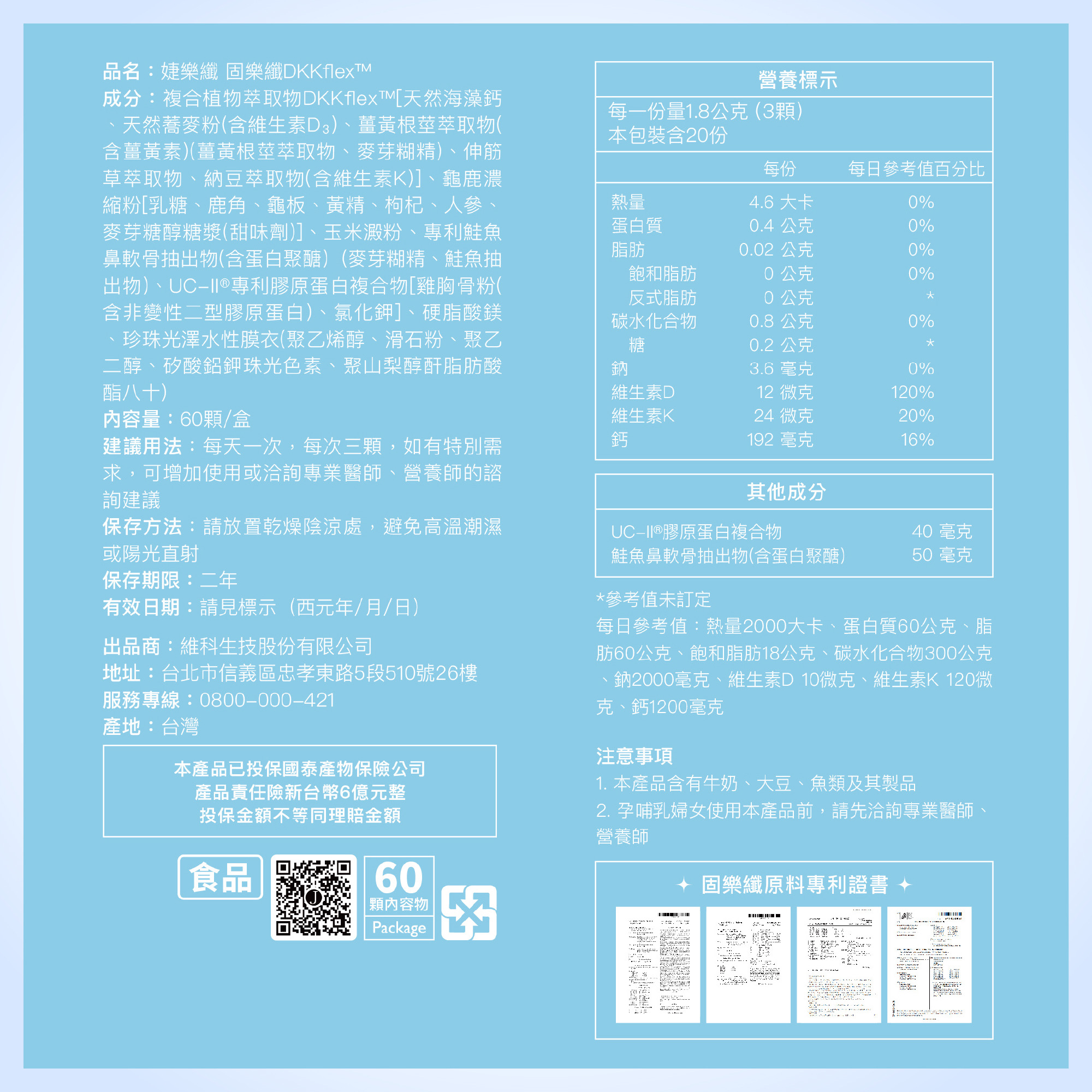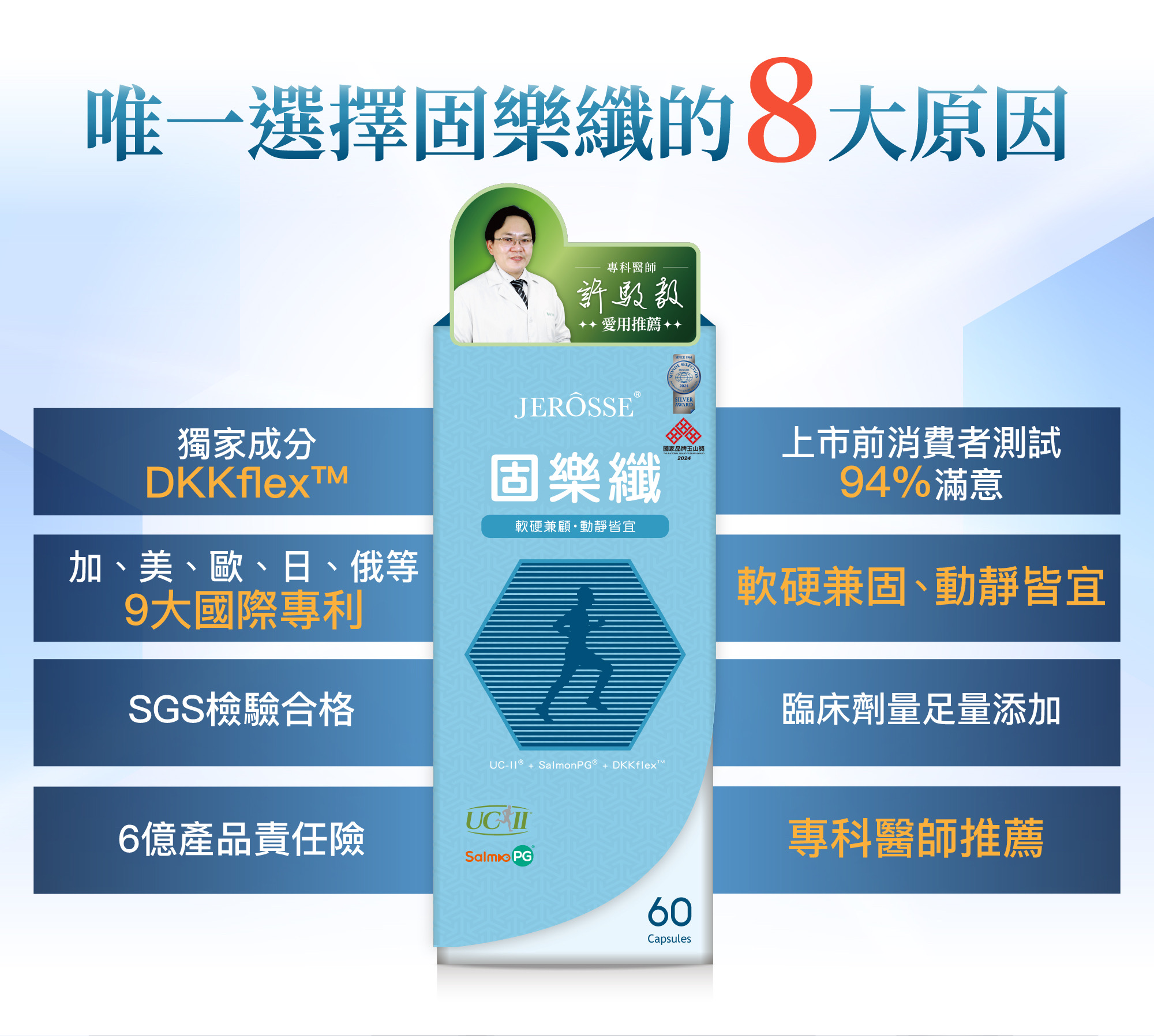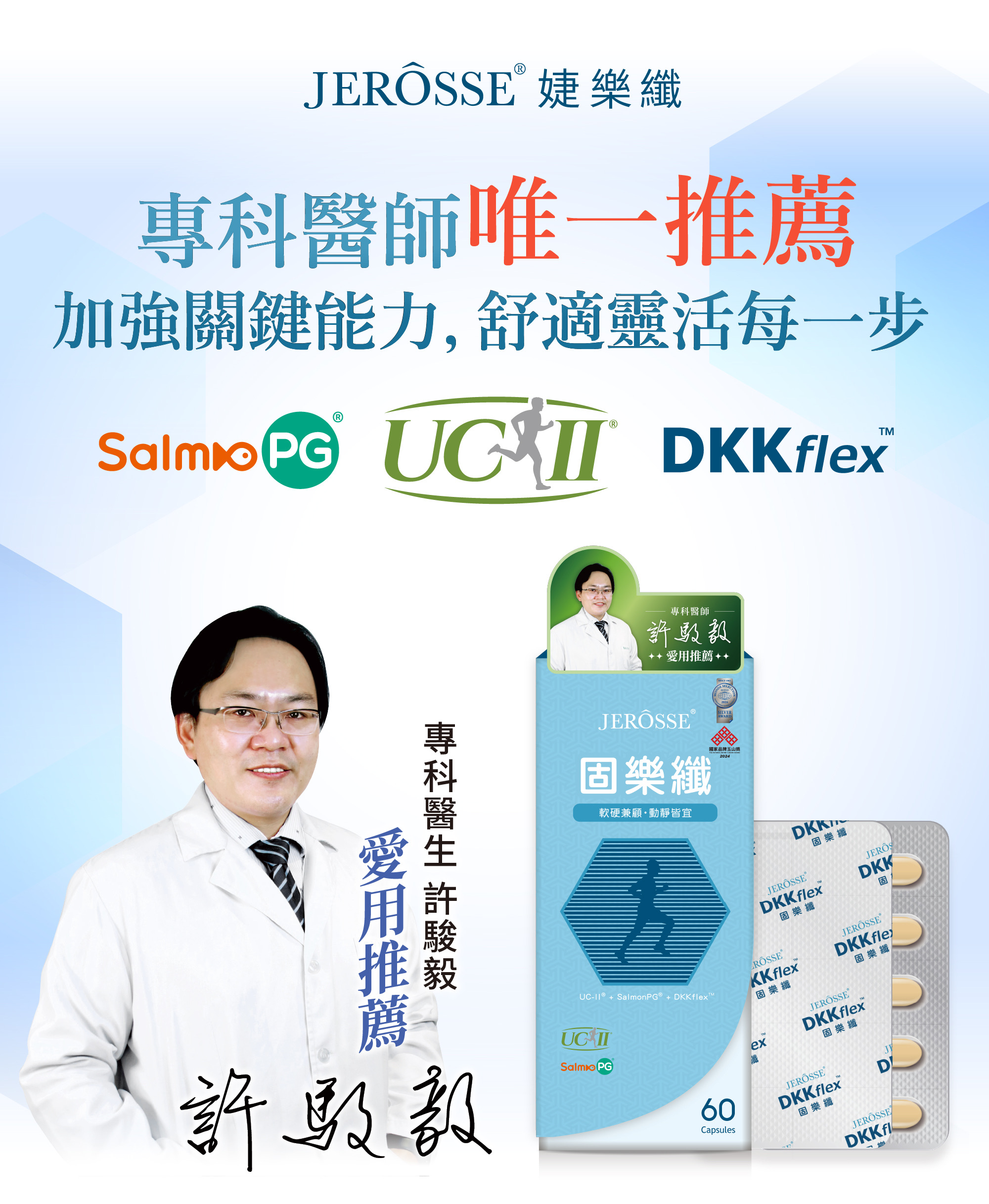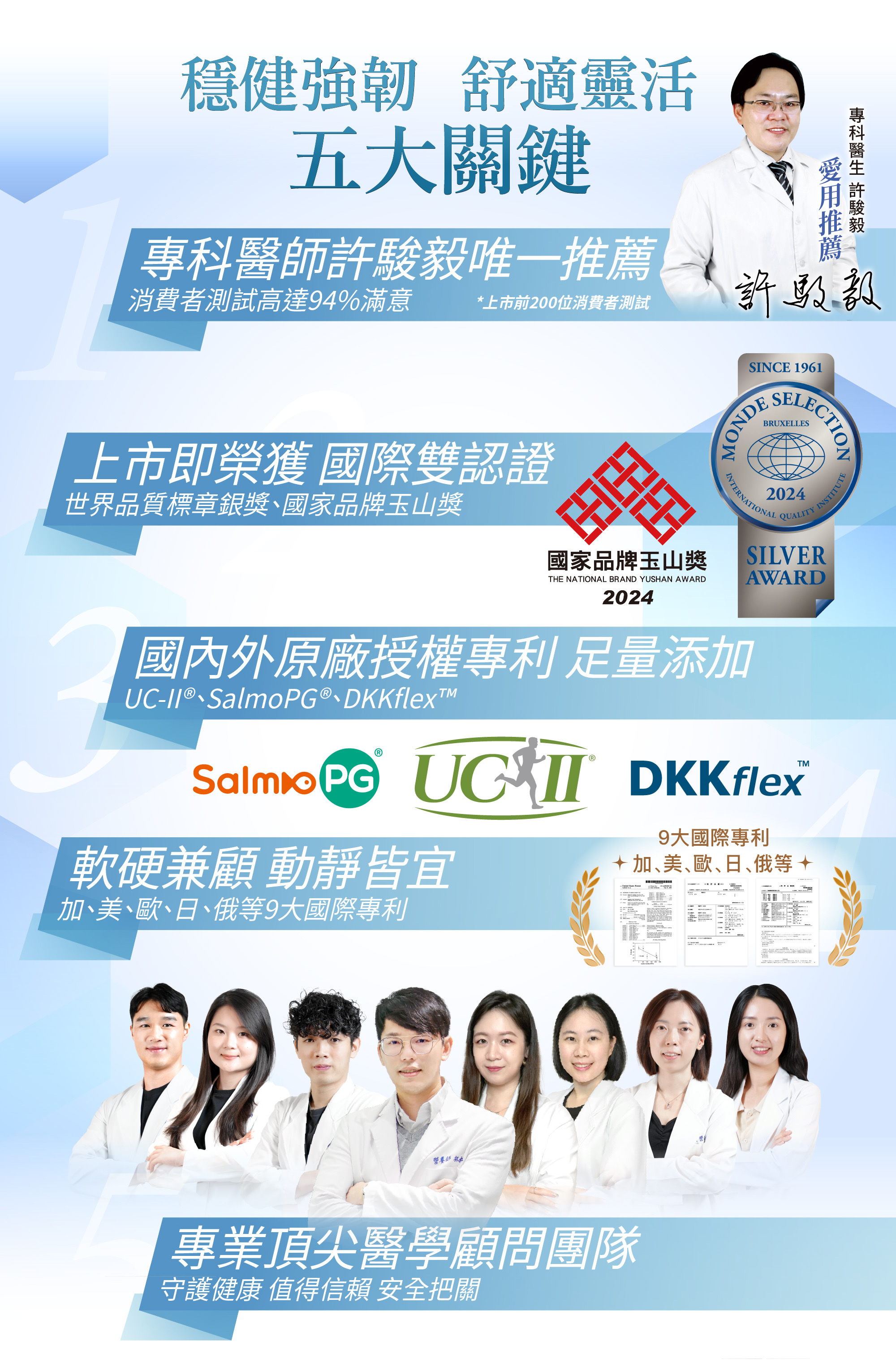 ▲美國6項專利非變性第二型膠原蛋白UC-II® 40mg ▲日本農林水産大臣獎&文部科學大臣獎 專利蛋白聚醣(鮭魚鼻軟骨)50mg ▲獨家專利成分DKKflex™,補充天然海藻鈣、維生素D、維生素K ▲專科專家 許駿毅醫師 愛用推薦