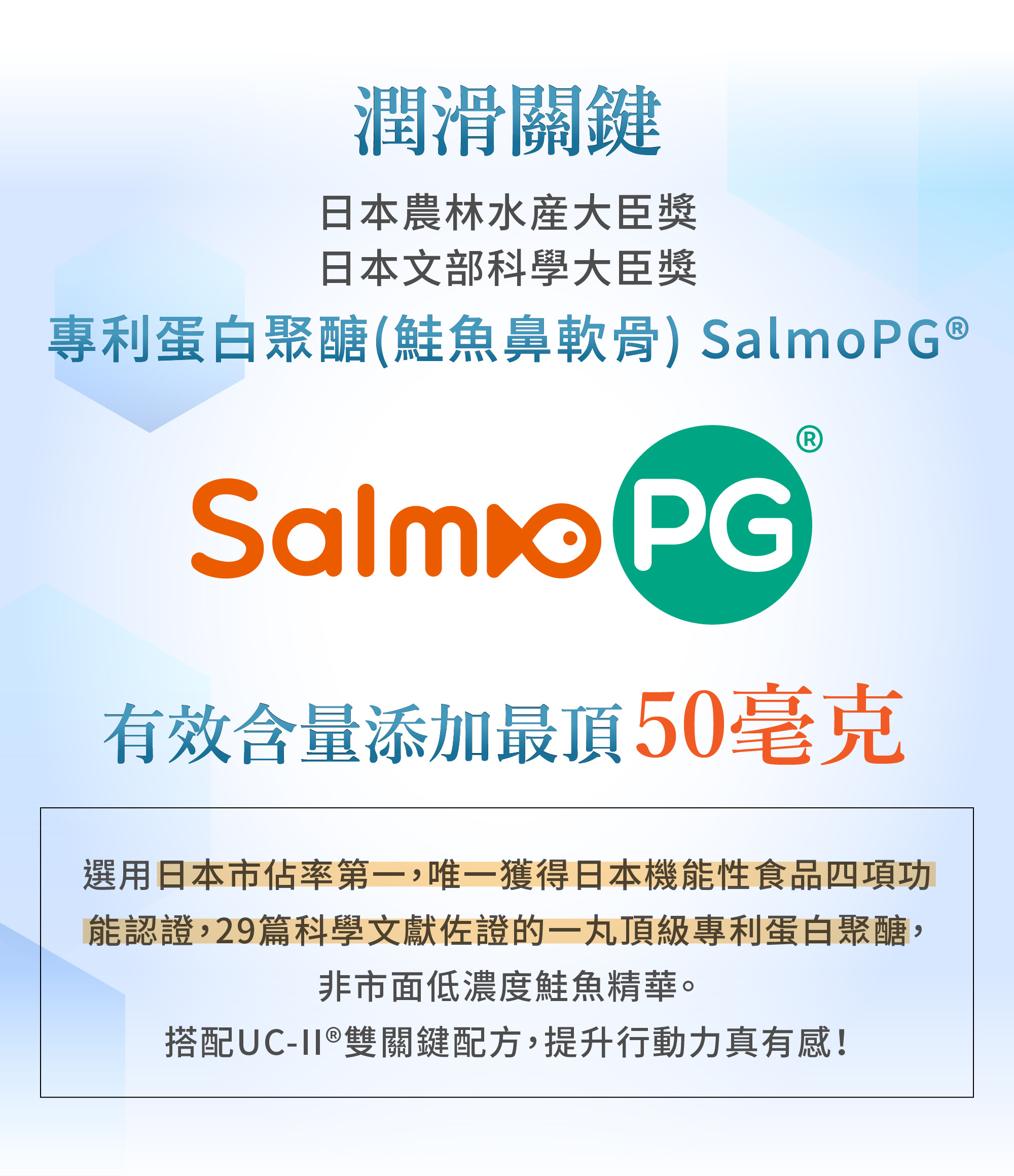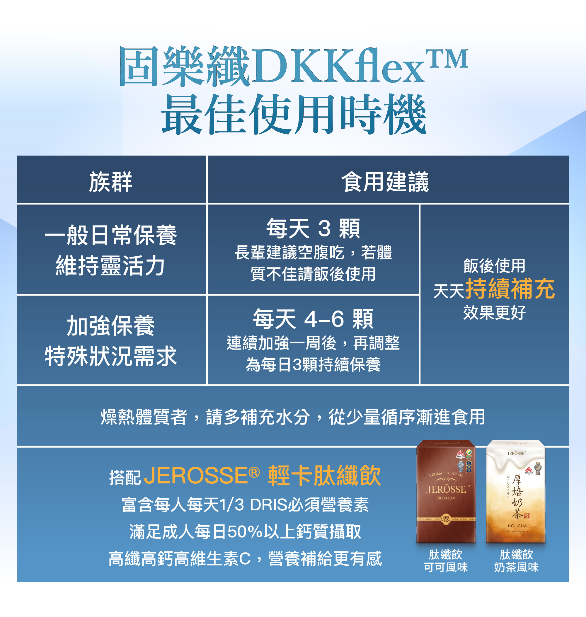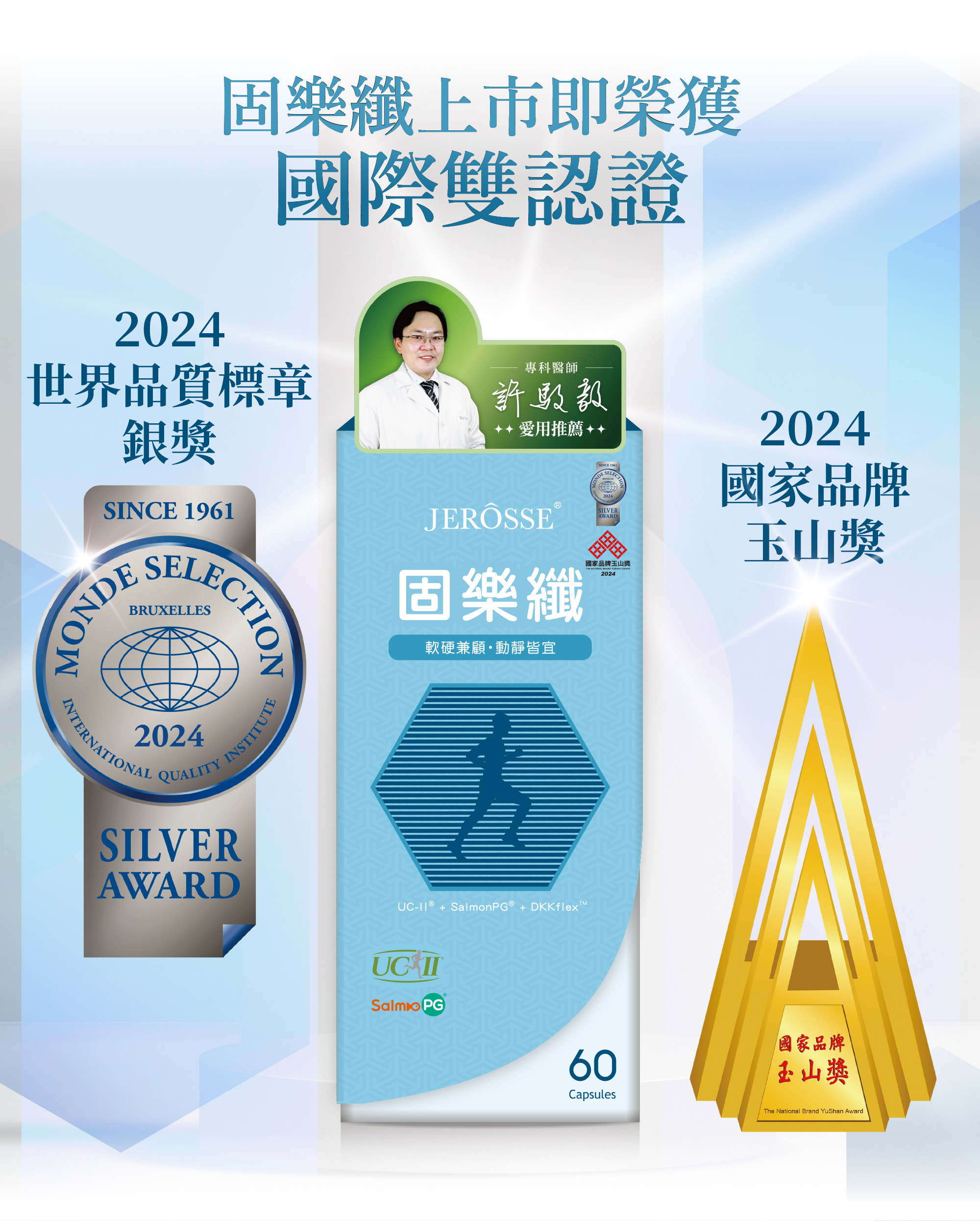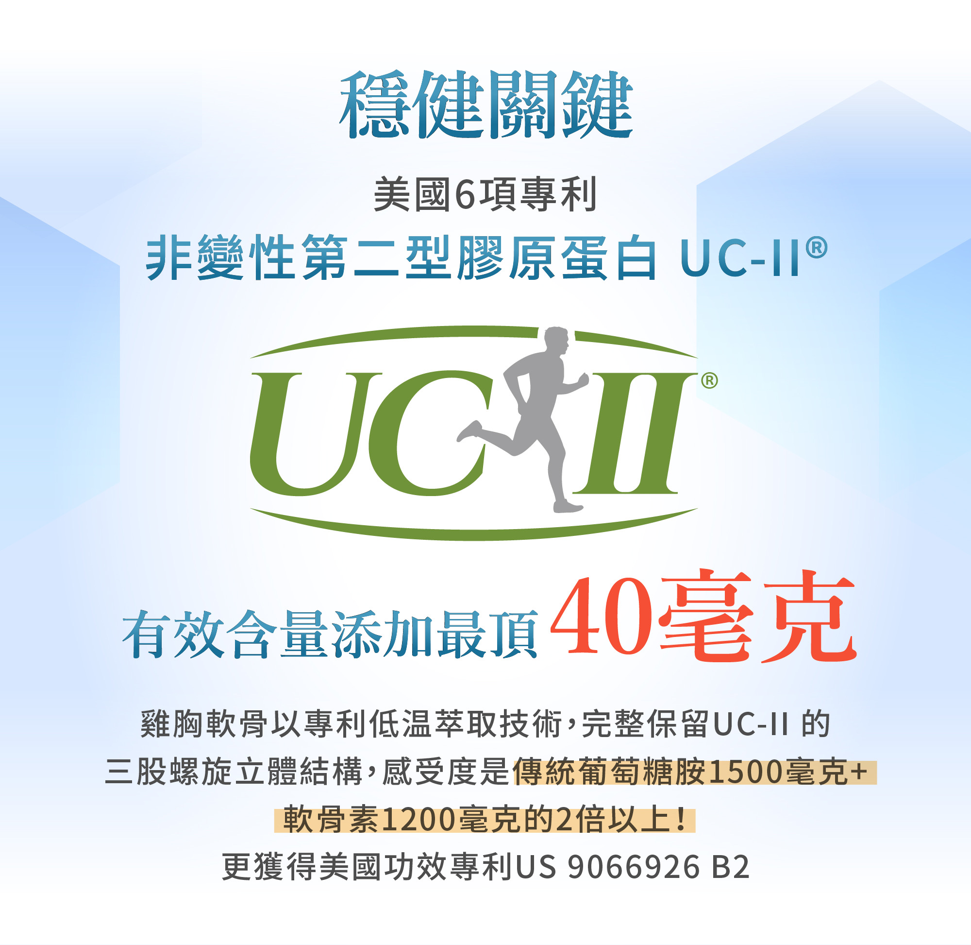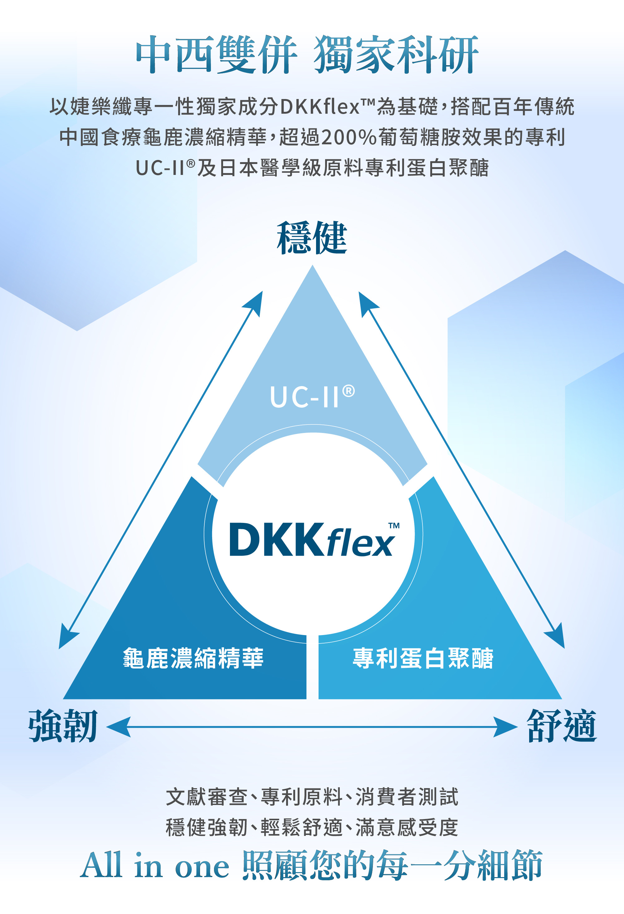 ▲美國6項專利非變性第二型膠原蛋白UC-II® 40mg ▲日本農林水産大臣獎&文部科學大臣獎 專利蛋白聚醣(鮭魚鼻軟骨)50mg ▲獨家專利成分DKKflex™,補充天然海藻鈣、維生素D、維生素K ▲專科專家 許駿毅醫師 愛用推薦