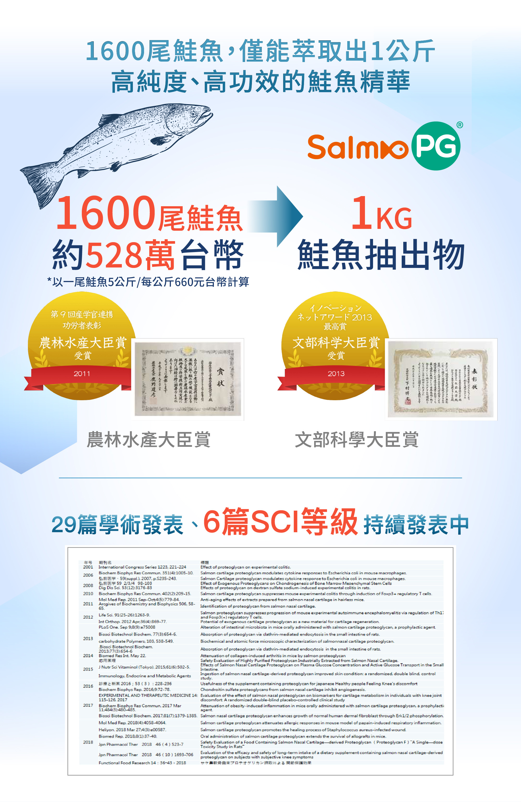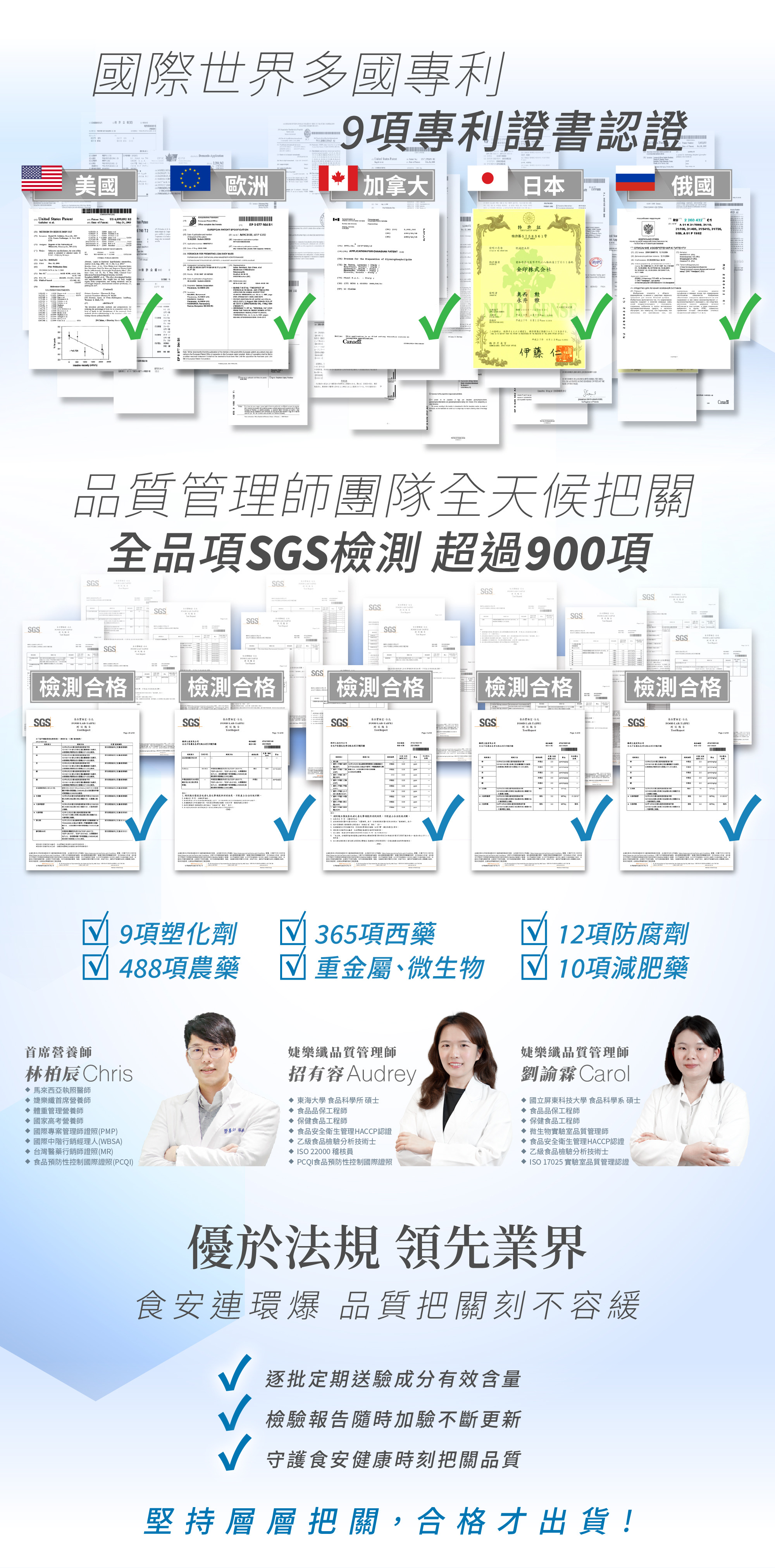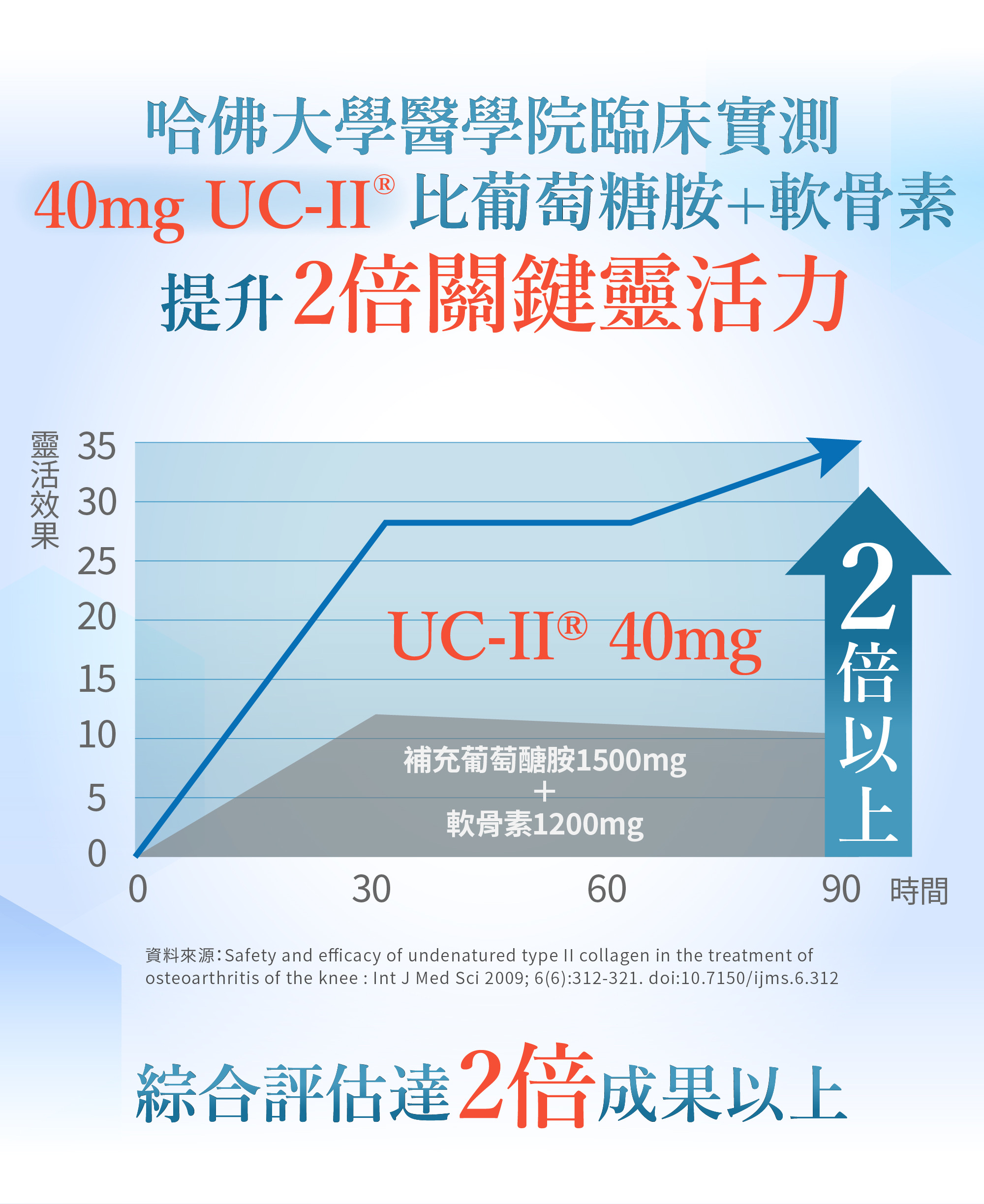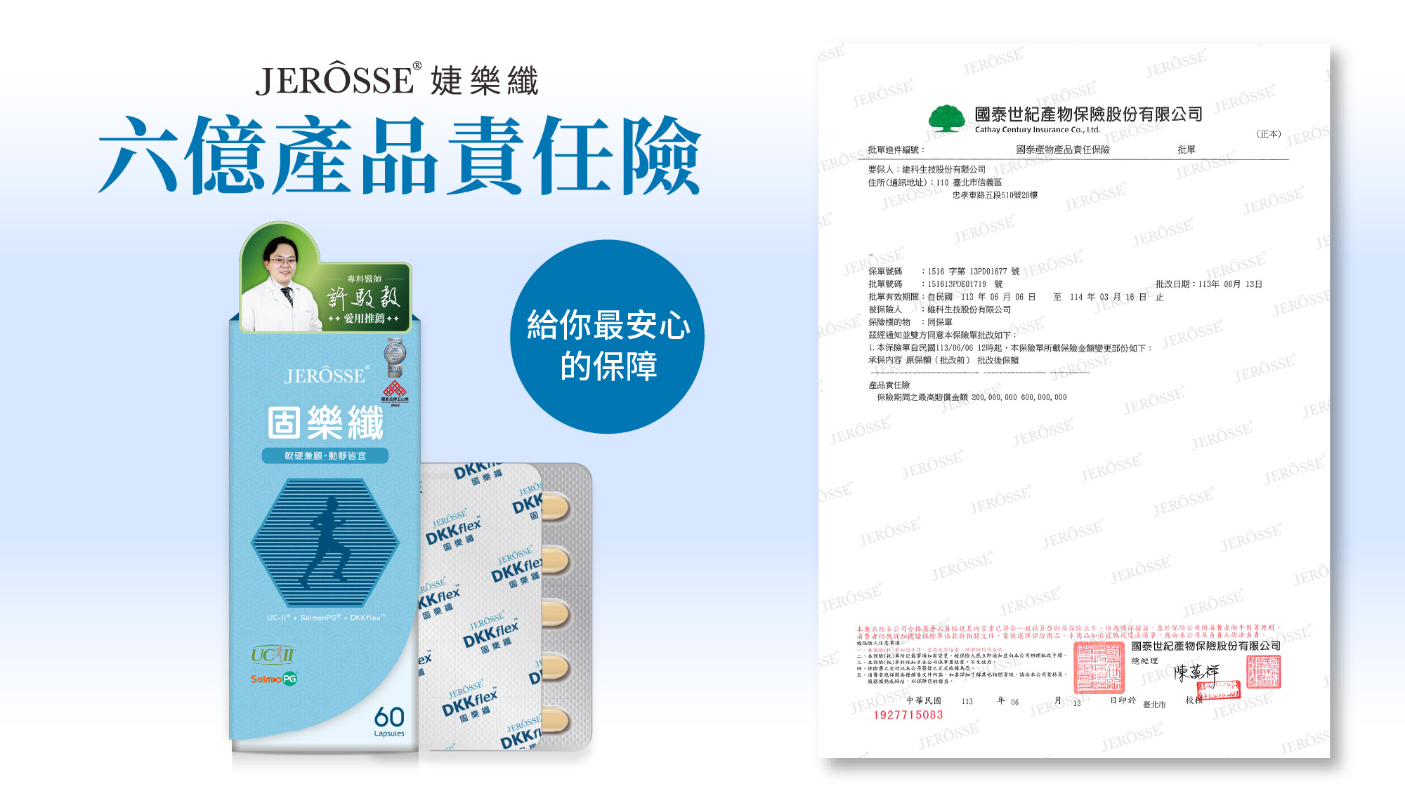 ▲美國6項專利非變性第二型膠原蛋白UC-II® 40mg ▲日本農林水産大臣獎&文部科學大臣獎 專利蛋白聚醣(鮭魚鼻軟骨)50mg ▲獨家專利成分DKKflex™,補充天然海藻鈣、維生素D、維生素K ▲專科專家 許駿毅醫師 愛用推薦